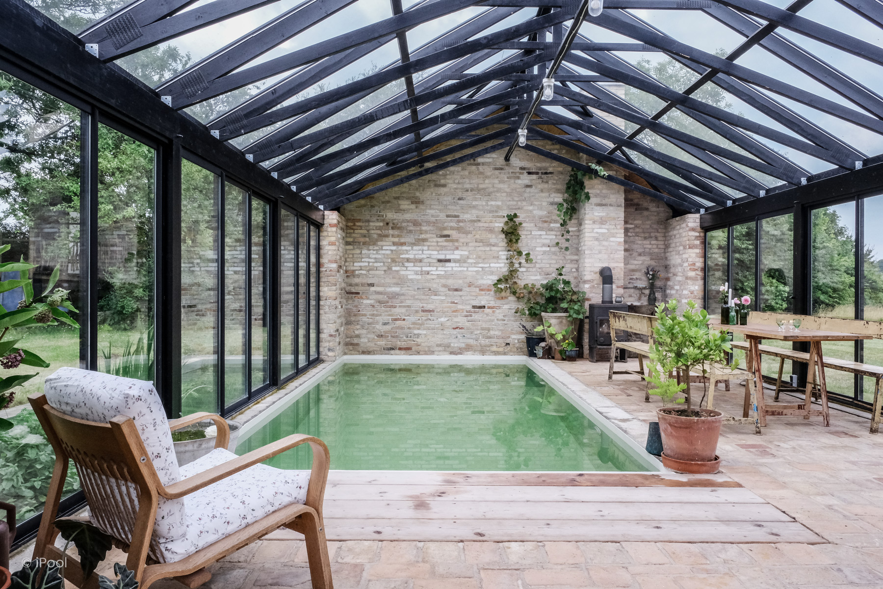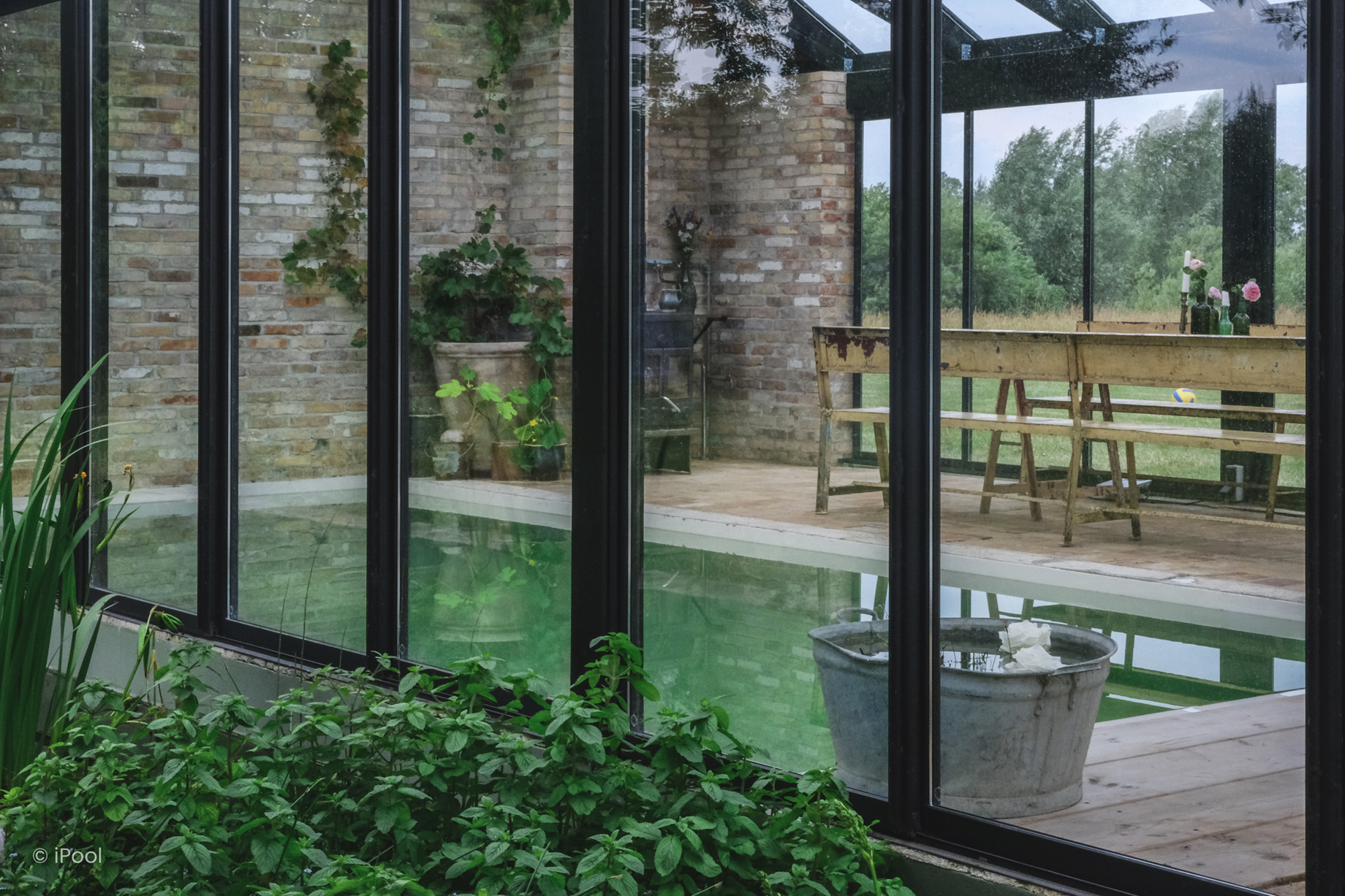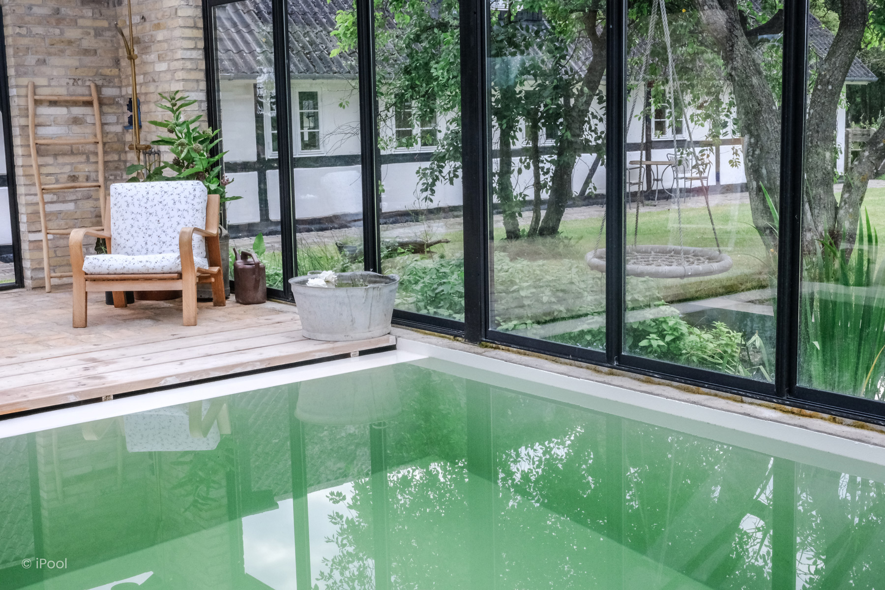 Midt i et lyst og indbydende orangeri ligger denne biopool – en bæredygtig og smukt designet oase. Den udviser, præcist dét den er – et åbent, ærligt vandelement, der opløser bekymringerne og inviterer til afslapning.