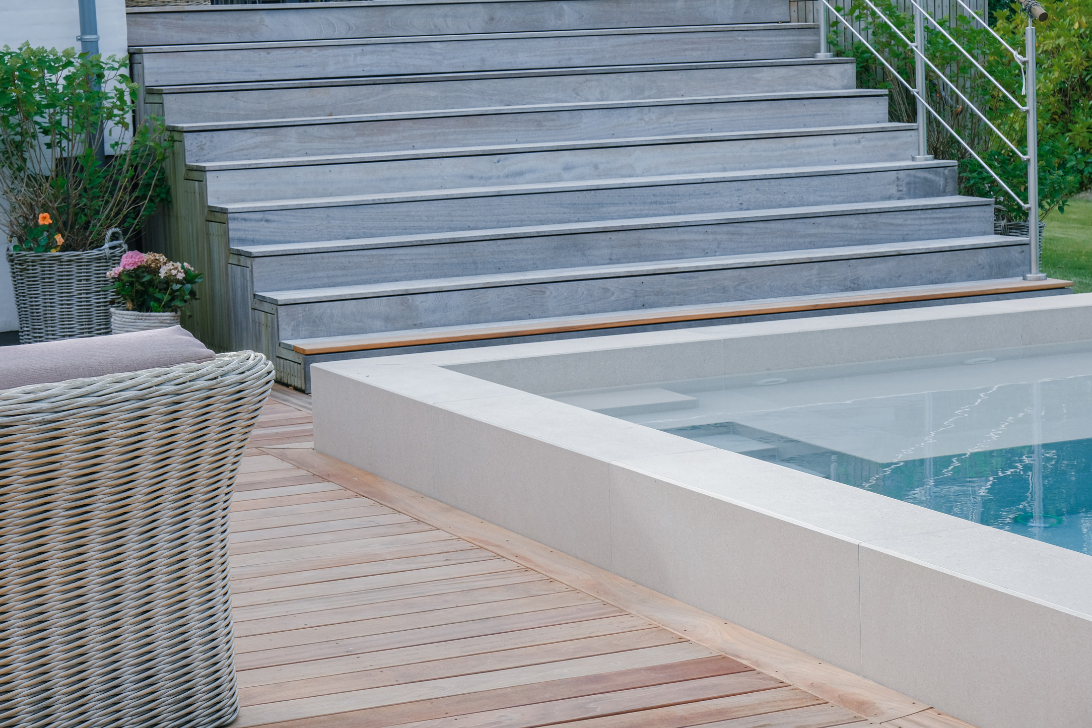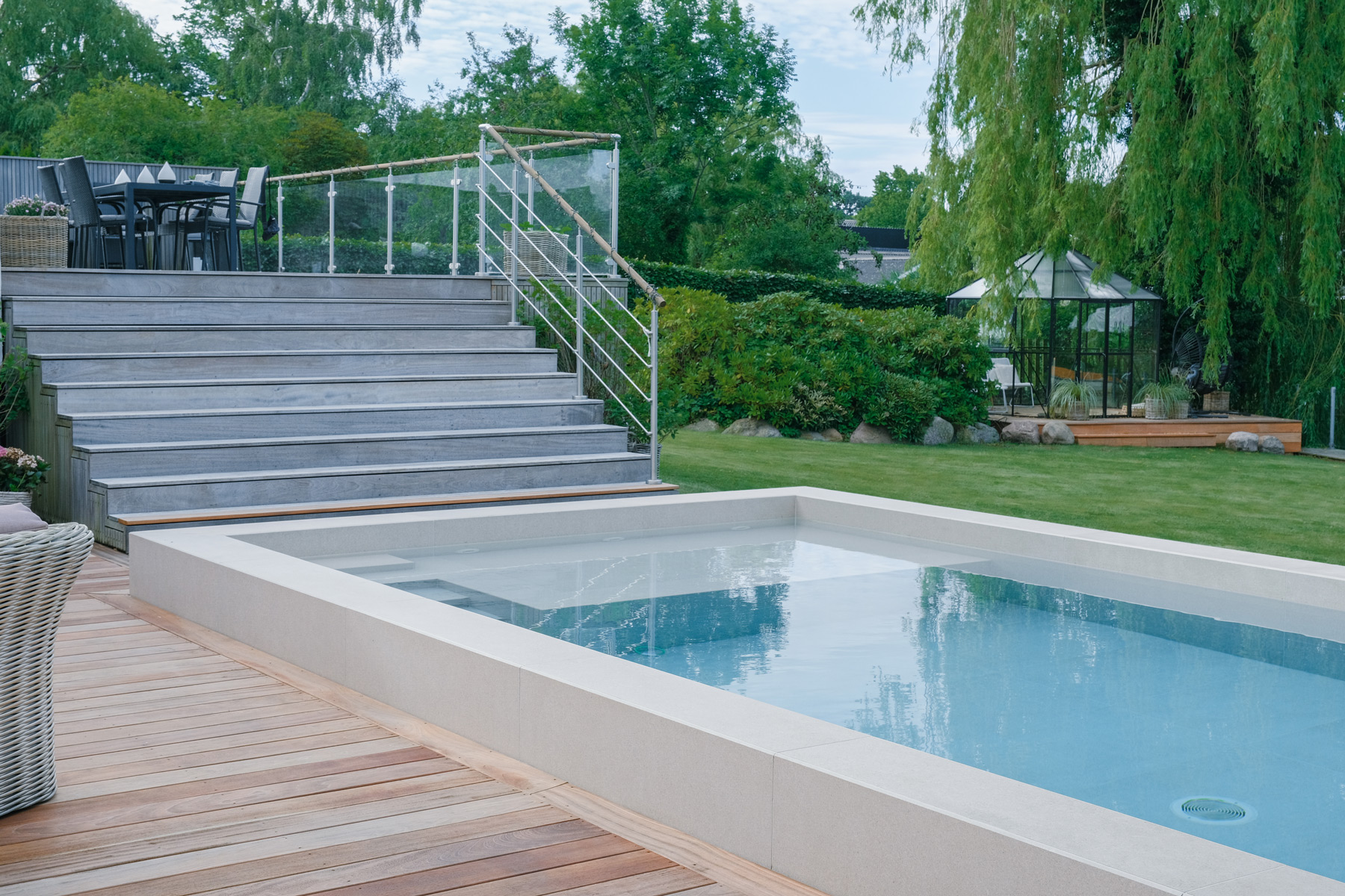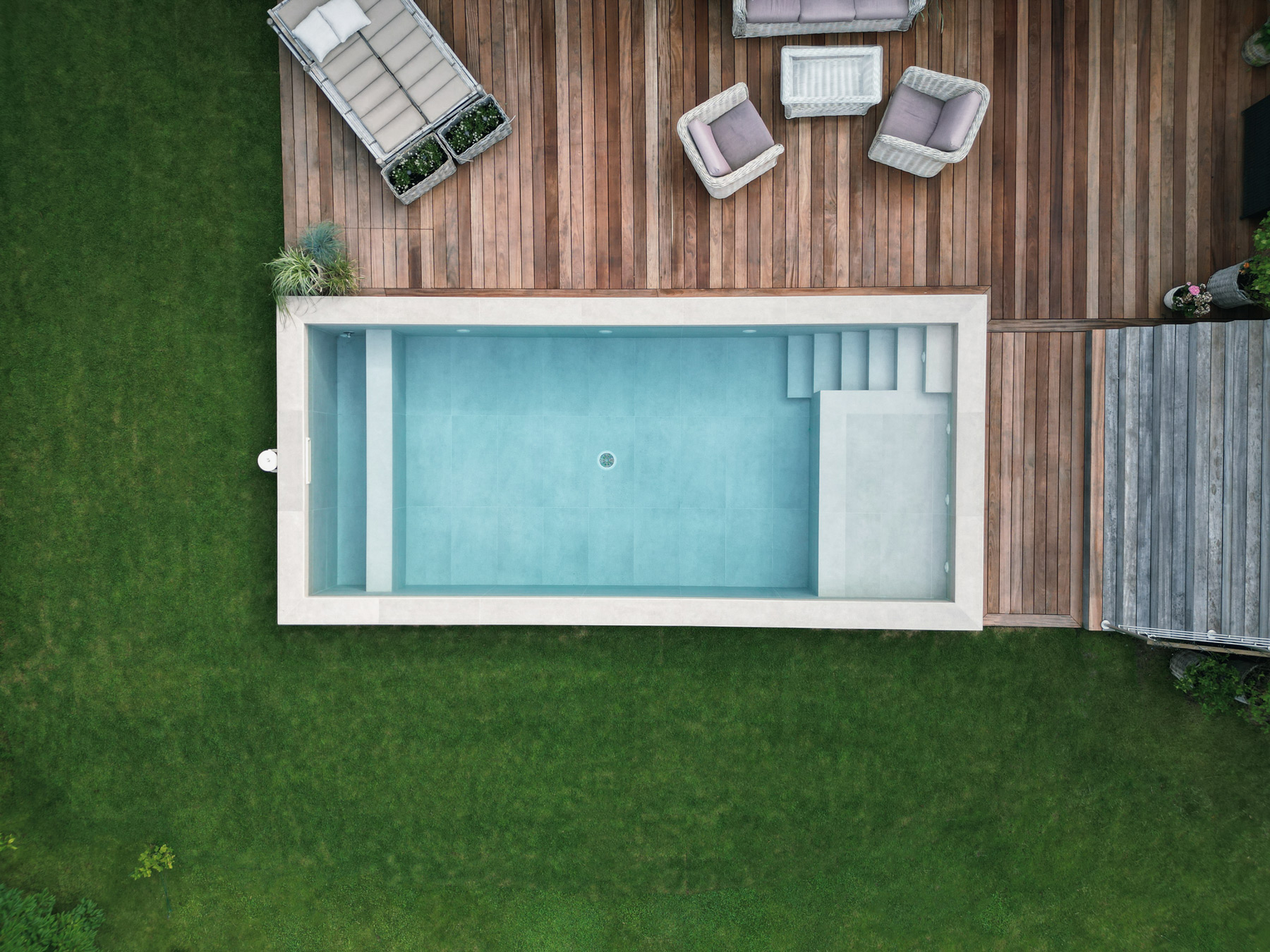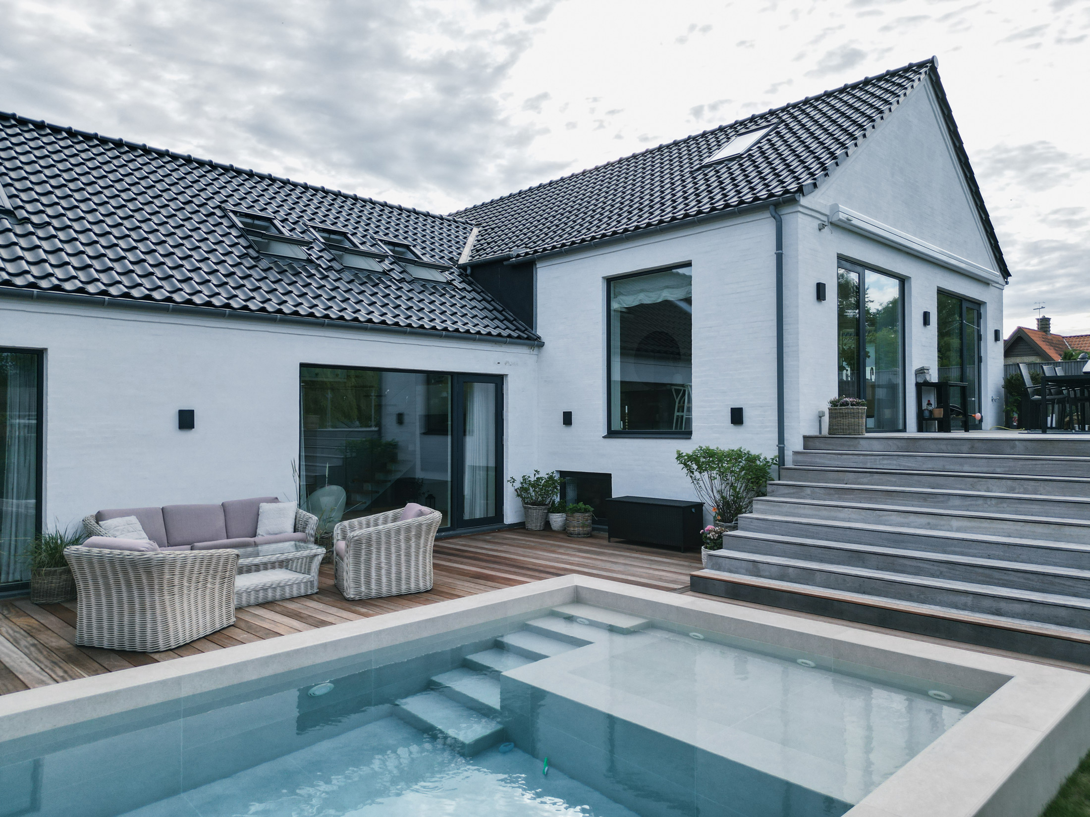 Denne elegante pool er etableret i 2025, hvor vi har leveret og monteret hele poolanlægget samt indstøbningsdelene i selve bassinet. Med keramiske kliner i storformat, et integreret plateau og fuldautomatisk styring er det blevet et unikt samlingspunkt i familiens have.